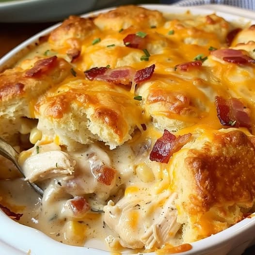 Przełóż mieszankę kurczaka i ciasteczek do przygotowanej formy do pieczenia i równomiernie rozprowadź.